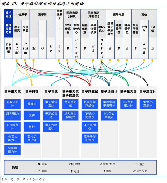 与量子计算和量子安全相比,量子精密测量在量子领域中市场规模较小,但应用范围最广。量子精密测量是借助外界变化对微观粒子影响来高精度测量物理量的技术,其核心优势在于开发和利用量子叠加、量子纠缠和量子非经典关联等量子物理特性,指数级提升传感测量方法的精度灵敏度和分辨率等关键指标,基本原理是外界的电磁场、温度、压力等物理量因素会改变电子、光子、声子等微观粒子的量子态,对这些变化后的量子态进行测量的精度和灵敏度会更高。根据实现方式不同,量子精密测量主要分为中性原子、离子阱、里德堡原子、固态自旋、超导以及其他传感技术。根据测量的物理量不同,主要分为磁场、电场、时频、位移/相位、旋转、压力、温度、重力等量子传感器。