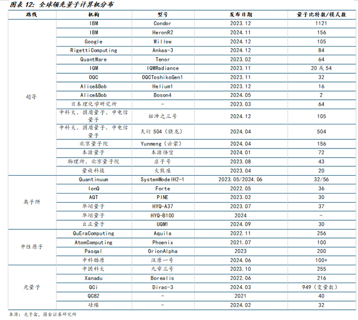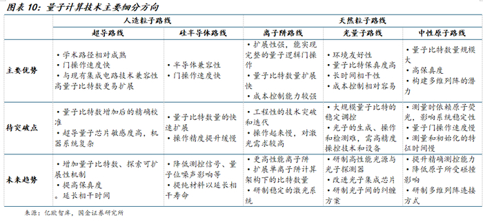 量子计算呈多元格局,超导量子计算和光量子计算是最有可能在特定领域实现商业化应用的路线。目前,量子计算呈现出多种技术路线并行发展的多元化格局,主要技术路线包括超导、离子阱、光量子、中性原子、硅半导体等。不同技术路线在量子比特的实现方式、性能特点、应用场景等方面各有优劣,尚未出现某一种技术路线占据绝对主导的局面。其中,超导技术路线有望凭借其在量子比特数量和量子纠错能力方面的相对领先地位,率先展现出实现大规模商业化的潜力,主要原因有两点:一是超导量子计算路线本身特点优势明显,比如保真度高、运算速度快、扩展性好、可控性强,从而受到更多科研人员与投资机构的关注。二是超导量子计算机与成熟的电子学、半导体工艺密切相关,而离子阱、中性原子等技术路线所用设备多为成熟度相对较低的光子学设备。同时,光量子路线由于具备可常温工作、相干时间长、保真度较高等优势,在量子优越性证明、光子纠缠操控试验等方面也取得了不少科研进展。例如中国“九章三号”原型机一经问世,便刷新了光量子信息的技术水平的世界纪录,并在金融、云计算等多个垂类行业开展了商业化探索。