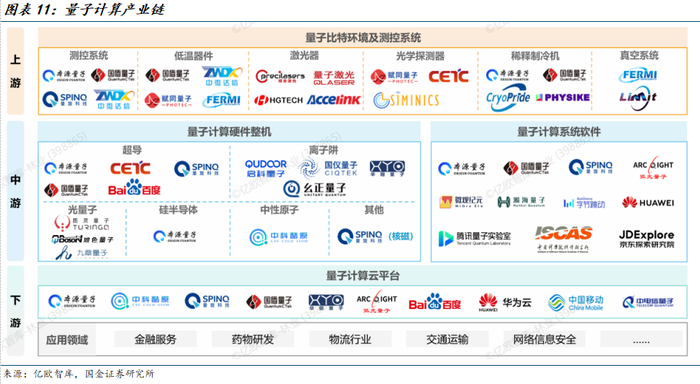 量子计算产业上游国产化进程提速,中游技术路线多元化发展,下游应用场景逐步丰富。目前,国内量子计算产业链呈现清晰的层级结构。上游聚焦核心器件与基础设施,涵盖量子比特测控系统、量子环境控制设备、专用芯片制造及关键材料供应,国产供应商在稀释制冷机、测控系统等核心领域不断突破;中游涵盖硬件系统集成与软件开发,包括超导、离子阱等主流技术路线的整机制造,以及量子算法、编译器和行业应用软件的开发;下游主要为商业化应用生态,通过量子云平台向金融、制药、交运等领域提供算力服务,推动行业解决方案落地。