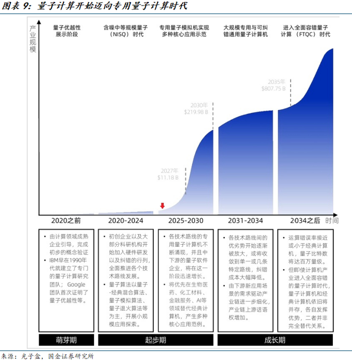 量子科技有望进入高速成长期,量子计算或为核心增长引擎。根据光子盒数据,2024年全球量子科技产业规模已达80亿美元,预计2024-2030年复合年增长率(CAGR)可达76.27%,到2035年整体规模更有望突破9000亿美元,而量子计算在其中占比近90%。当前,量子信息技术处于导入期尾声,技术瓶颈如量子纠错能力、相干时间等仍制约着大规模商业化进程,但数据安全需求与算力需求的爆发式增长,正推动量子通信、量子计算及量子精密测量等技术不断取得突破。随着技术成熟度持续提升,行业将从导入期逐步迈向成长期,届时量子领域商业化潜力将得到全面释放,有望形成万亿级市场规模。