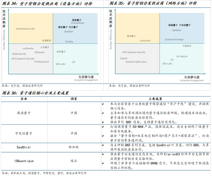 中国在量子通信领域处于领先地位。当前,中国量子密钥分发技术已实现量子安全领域产品的商业化,并在较大范围内应用。因此,量子密钥分发供应商在技术成熟度和生态参与度方面分布较为均衡。设备方面,国盾量子QKD设备在工作距离和集成度等关键应用指标上达到国际先进水平。网络方面,国盾量子、中电信量子等凭借成熟技术与广泛生态合作,在产品商业化上成果显著,多次参与建设国内量子保密通信应用示范网,市场优势明显,未来有望持续领先。