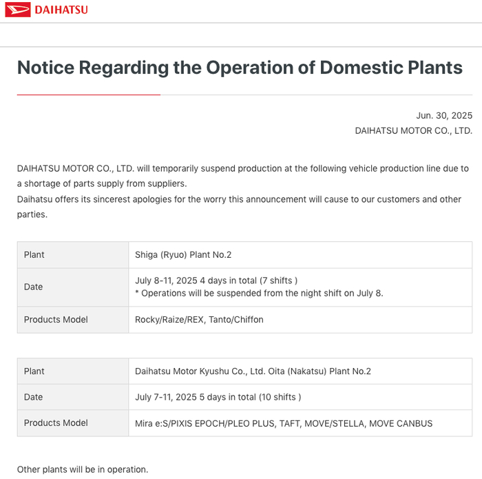 6月30日,丰田汽车旗下大发汽车发布公告称,因供应商零部件供应不足,大发汽车旗下日本整车工厂将暂停运营,其中,7月8日至11日共计4天暂停滋贺第二工厂运营,涉及的产品包括Rocky/Raize/REX,Tanto/Chiffon;7月7日至11日共计5天暂停大分中津第二工厂运营,涉及的产品包括Mira e:S/PIXIS EPOCH/PLEO PLUS,TAFT, MOVE/STELLA, MOVE CANBUS。