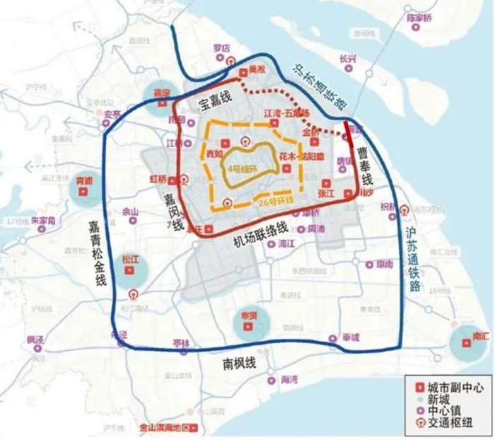 第三环线系统由宝嘉线-嘉闵线-机场联络线-曹奉线-新沪通线构成,重点强化宝山、嘉定、闵行、浦东的产业协同,赋能武松创新城、远香湖智慧核、大虹桥枢纽等战略节点。郊域环线则通过嘉青松金线-南枫线-沪通铁路线,构建五大新城联动发展轴,提升长三角城市群辐射能级。