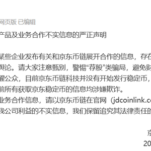 声明表示,目前京东币链科技并没有开始发行稳定币,也没有设立任何相关社区,目前所有获取京东稳定币的信息均涉嫌欺诈。有关产品和企业业务合作信息,请以京东币链在官网发布的信息为准。对侵犯京东利益的不实信息,保留追究其法律责任的权利。