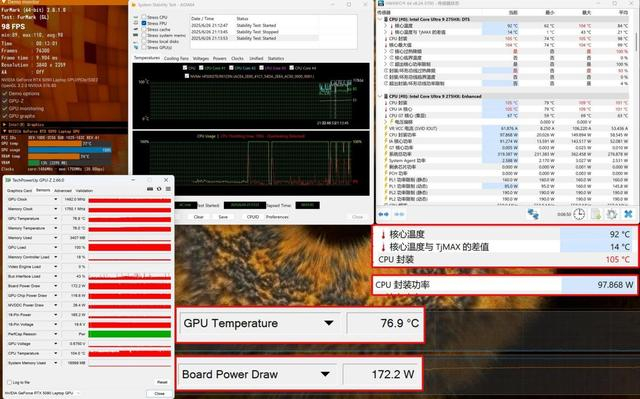 此外,得益于优异的散热架构设计,掠夺者·战斧18 AI旗舰电竞本在AIDA 64+Furmark双烤机测试中,CPU功耗平均为97.868W,核心温度92℃,GPU平均功耗172.2W,处于满功耗释放状态,平均温度仅为76.9℃,总体功耗释放达到270W,但CPU和GPU温度比同类产品要低不少。这也是为什么这款机器在整体性能释放上表现出色的根本原因。