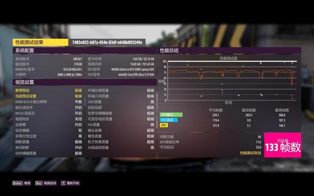 《极限竞速:地平线5》我们同样采用了4K分辨率进行测试,画质设定为极端,最终平均帧率达到133fps,同样达到了极高的流畅度。