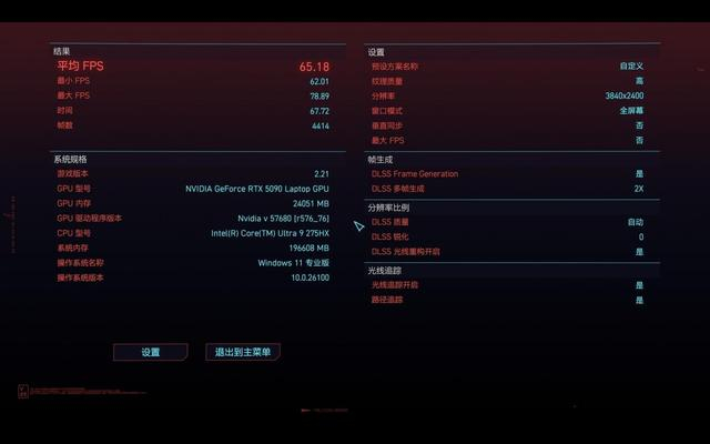 《赛博朋克2077》开启超速光追,4K分辨率,分别开启2X、3X、4X多帧生成的情况下,平均帧数分别达到了65.18fps、100.83fps以及127.1fps,帧数接近翻倍。而且4K+全局光追的效果充分展现出了《赛博朋克2077》这款游戏绝美的未来科幻场景。