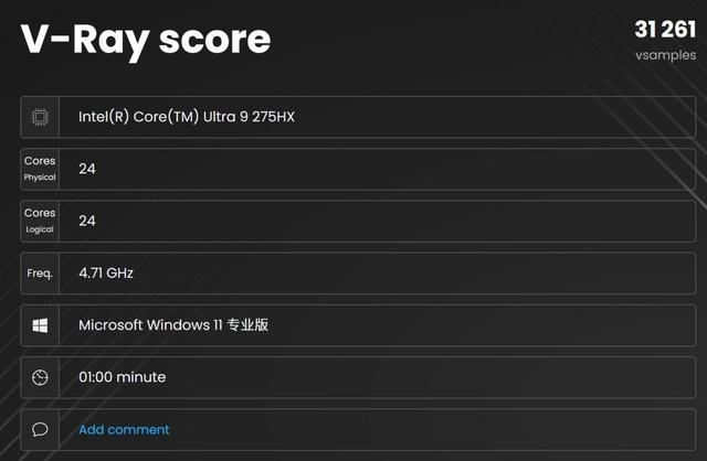 渲染采样方面,V-Ray Benchmark一分钟采样率为31261vsamples,整体效率不错,相比14代酷睿i9-14900HX提升显著。