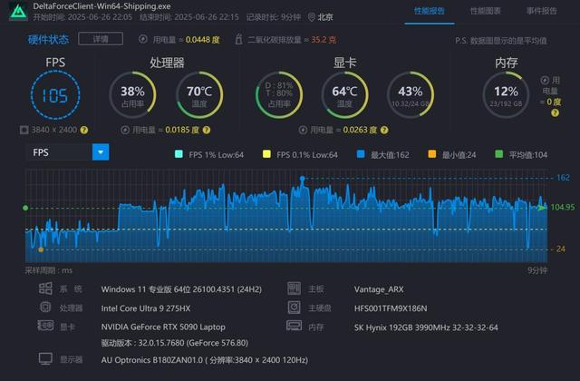 首先是《三角洲行动》,之前笔者因为电脑配置不够,一直在2K屏幕上玩这款游戏,但这次借着掠夺者·战斧18 AI旗舰电竞本的评测,在4K分辨率、最高画质下体验了一把,着实是惊艳,而且平均流畅度可以达到105fps,大屏+高分辨率玩起来真是爽爆!