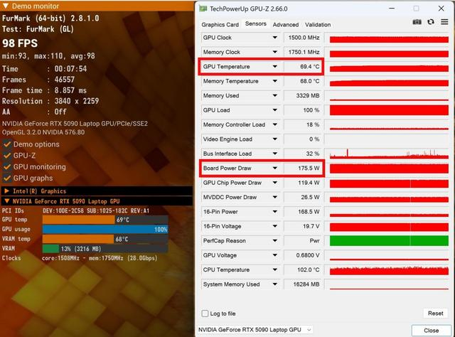 GeForce RTX 5090笔记本电脑GPU满功耗为175W,掠夺者·战斧18 AI旗舰电竞本自然可以轻松稳定在175W功耗释放,而且GPU平均温度仅为69.4℃,散热系统的效率相当出色。