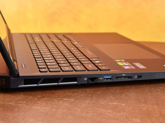 机身右侧配有标准的RJ45网口、1个USB 3.2 Gen 1 Type-A接口,标准SD卡插槽以及3.5mm耳麦插孔。