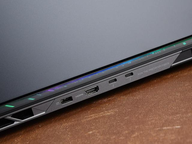 机身尾部则配备了电源接口,标准HDMI 2.1视频端口,以及2个雷电5接口(支持PD充电和DP输出)。作为18英寸超大尺寸产品,接口扩展性自然不必担心,掠夺者·战斧18 AI旗舰电竞本提供了大满贯接口配置,且整体布局非常合理,方便用户的外部设备扩展。