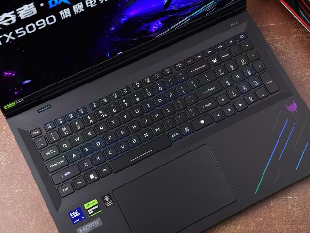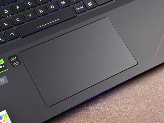 掠夺者·战斧18 AI旗舰电竞本的腕托区域非常舒适,硕大的面积可以为用户带来很好的腕部承托,而且表面漆面的触感极为柔和顺滑,长时间使用电脑腕部不会感到疲劳。另外它的触控板位于空格键正下方,表面触感光滑,操控定位精准,左右按键无死区。