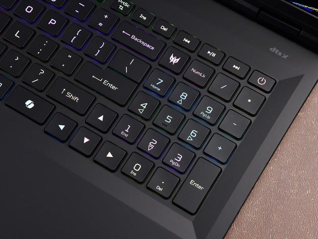18英寸超大机身让掠夺者·战斧18 AI旗舰电竞本的键盘区域布局游刃有余,全尺寸方向键、大面积腕托、空格键正下方的触控板排布、独立数字键区这些设计规避了C面常见的一些槽点,带来了非常不错的操控体验。