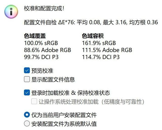 色域方面,这块屏幕支持100% sRGB、99.7% DCI P3色域覆盖,sRGB色域容积达到了161.9%,DCI P3色域容积达到了114.7%,色彩呈现细腻,达到了专业级显示器的色域水准。