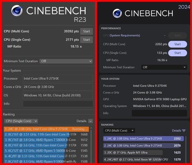 CINEBENCH R23单核得分2171,多核得分39392;CINEBENCH 2024单核得分133,多核得分2202,在单核和多核性能方面,酷睿Ultra 9 275HX甚至超过了锐龙9 9955HX3D处理器。