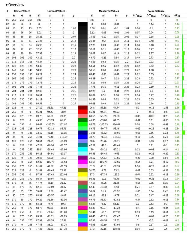 色准方面的调校也非常不错,平均ΔE值仅为0.55,最大也仅为1.56,这表明这块屏幕有着极低的色彩偏离度。另外参考色准偏离图谱,51种色彩中只有6种色彩偏离度高于1,总体色准调校绝佳。