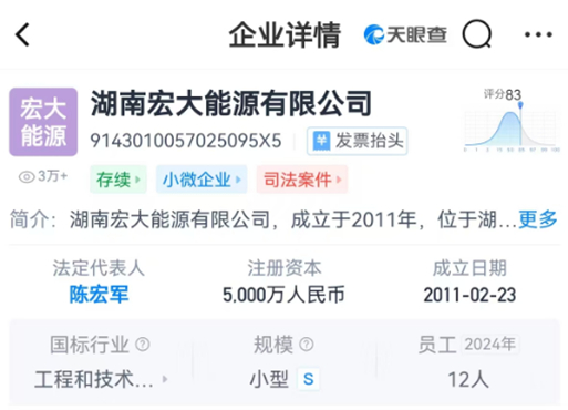 但据公开资料显示,“湖南宏大能源有限公司”成立于2011年,注册资本为5000万元,2024年登记的员工人数仅有12人,企业规模为小型。这样一家经营规模和体量的公司,却能成为一家能源大央企重要子公司的合作方,而且还对应着超4亿元的出资,是不是挺有意思的?