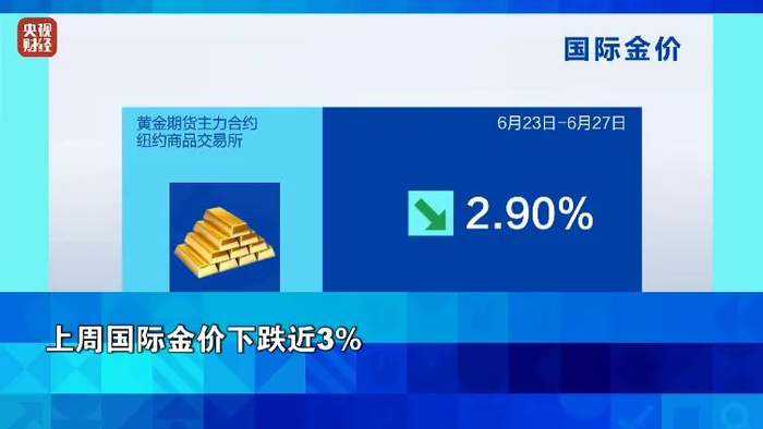 因市场避险情绪降温,黄金价格持续回落,上周(6月23日—27日)国际金价累计下跌2.90%。