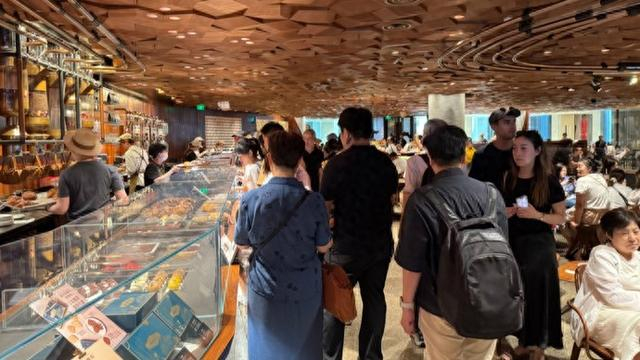 一旁的星巴克臻选上海烘焙工坊无疑是这场消费热潮的直接受益者之一。6月30日下午2时30分,店内座无虚席,门口的外摆位同样热闹非凡,二楼甜品区更是排起了长队。一名星巴克店员告诉记者,“路易号”启航以来,门店多次启动限流模式,顾客须排队等候进场。6月28日是周六,一直限流到晚上9时30分。6月29日是周日,上午10时30分,星巴克又开始限流,人气之旺,可见一斑。