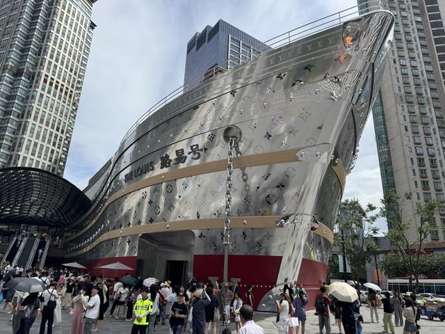 这座时尚“巨轮”不仅吸引了外地游客与国际友人纷至沓来,更唤起了本地居民对这片土地的深厚情感与美好回忆。退休老人赵先生与几位老同事坐在星巴克窗户边,说道:“原来我们厂就在久光百货停车场那个位子,后来动拆迁搬走了,听说这里来了一艘LV大船,我们相约来打卡。没想到星巴克也这么火爆,我们今天等位半个多小时才找到座位。”