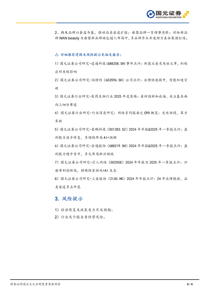 传媒商社:上美股份,2145.HK——1、公司618成绩亮眼,韩束品牌登顶抖音美容护肤类目TOP1,一页品牌三位数增长,安敏优高双位数增长。2、韩束品牌以套盒为基,推动品类渠道扩张;母婴品牌一页增势亮眼;彩妆新品牌NAN beauty及母婴新品牌面包超人布局中,多品牌齐头并进助力美妆集团打造。