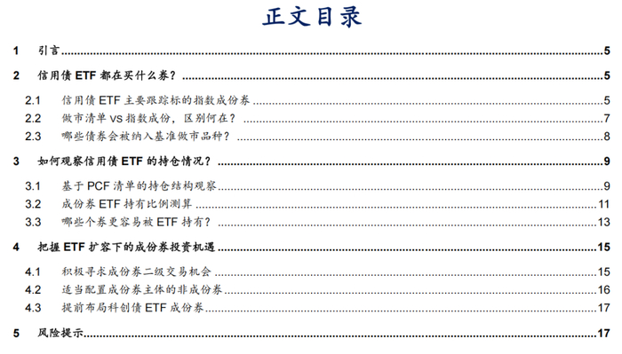 从影响看,作为以实物交割为主的交易性开放式指数基金,信用债ETF规模的增长会转化为对信用债的配置需求,进而推动相关个券流动性的提升与收益率的下行,其交易性价比显著较高。因此本篇报告将从该角度出发,重点关注ETF持仓成份券的范围与市场表现,并分析相关债券参与的机会与风险。
