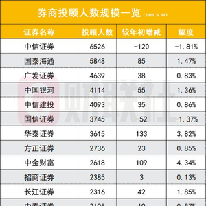 投顾人数排名前十券商依次为中信证券(6526人)、国泰海通(5848人)、广发证券(4639人)、中国银河(4114人)、中信建投(4093人)、国信证券(3745人)、华泰证券(3615人)、方正证券(2736人)、中金财富(2618人)、招商证券(2385人)。