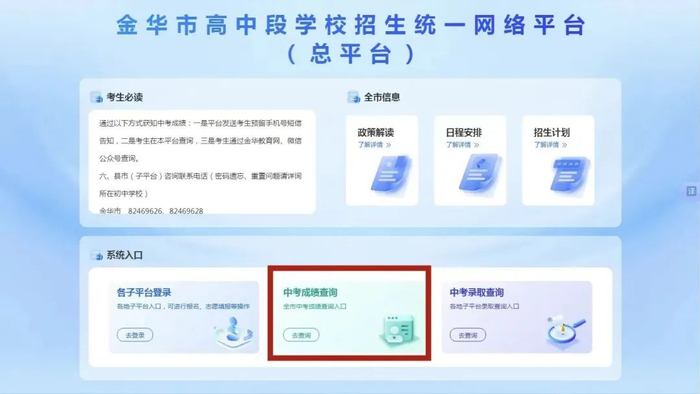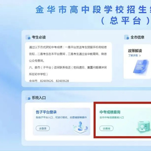 中考成绩于7月1日晚发布。考生可以登录“金华市高中段学校招生统一网络平台”(网址:https://jhzk.zjxspj.com)查阅。