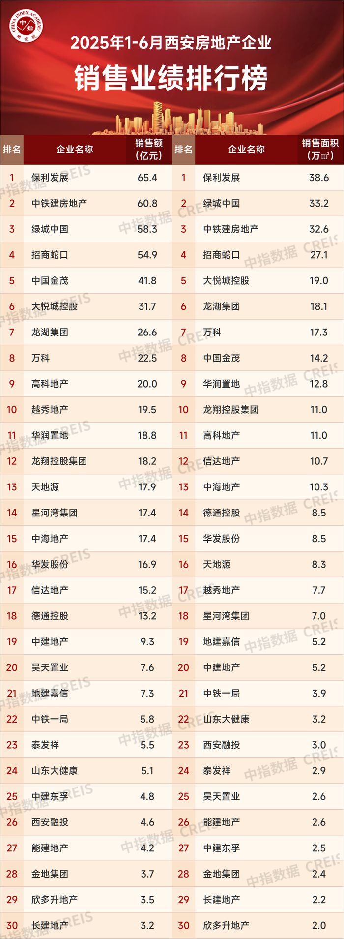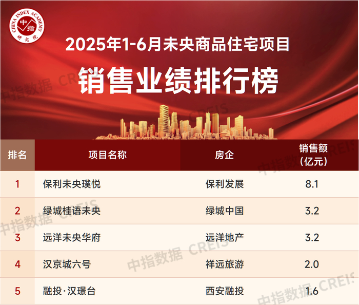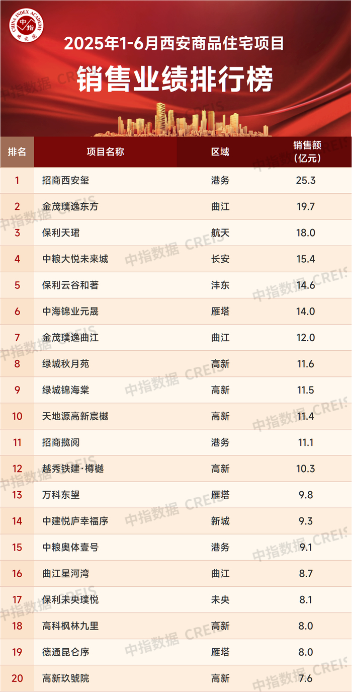 数据说明:房地产企业销售数据统计是以2025年1月1日-6月30日期间销售的商品房为统计口径,主要依据中指数据CREIS(点击查看)在西安的销售监测数据,并参考当期总体经营情况和推盘去化情况进行分析统计;对于少数没有在监测范围内的代建项目,由企业提供相关证明文件,经课题组对数据进行严格审核,也纳入统计范围。本报告仅供参考,课题组不对使用报告及其内容所引发的任何直接或间接损失承担责任。