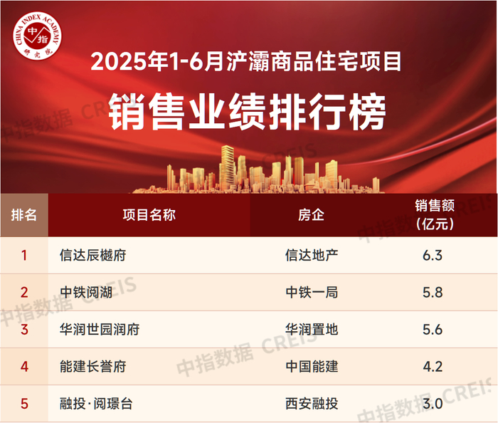 数据说明:房地产企业销售数据统计是以2025年1月1日-6月30日期间销售的商品房为统计口径,主要依据中指数据CREIS(点击查看)在浐灞、未央的销售监测数据,并参考当期总体经营情况和推盘去化情况进行分析统计;对于少数没有在监测范围内的代建项目,由企业提供相关证明文件,经课题组对数据进行严格审核,也纳入统计范围。本报告仅供参考,课题组不对使用报告及其内容所引发的任何直接或间接损失承担责任。