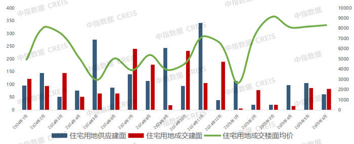 图:2024-2025年6月西安住宅用地市场供销情况统计