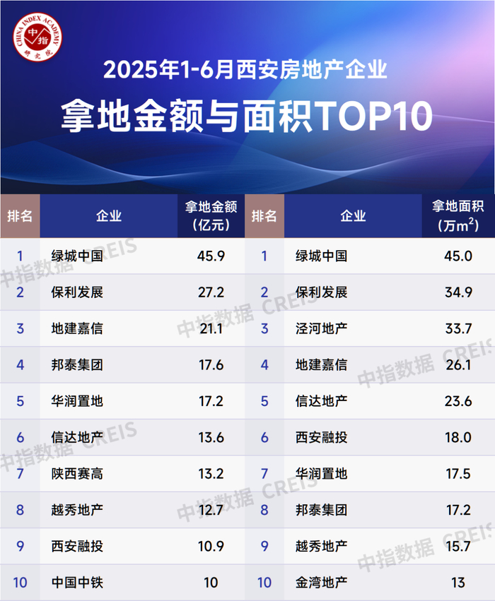 说明:房企拿地房数据范围包含以2025年1月1日-6月30日期间招拍挂及收并购土地,以中指土地数据库西安全境作为监测对象,可售型物业土地为标准,一级土地开发及产业、文旅等用地不予统计。榜单为中指研究院根据相关成交数据算所得,对于少数没有在监测范围内的项目,由企业提供相关证明文件,经课题组对数据进行严格审核,也纳入统计范围。本报告仅供参考,课题组不对使用报告及其内容所引发的任何直接或间接损失承担责任。