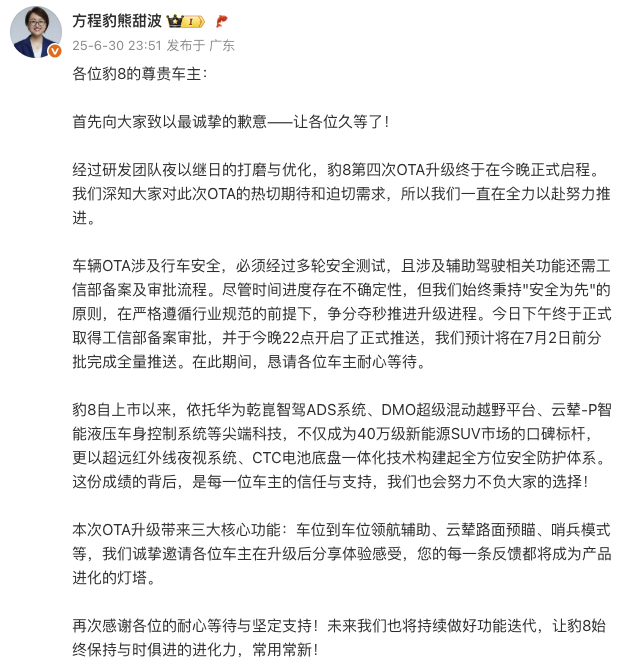 方程豹熊甜波:豹8第四次OTA预计7月2日前分批完成全量推送