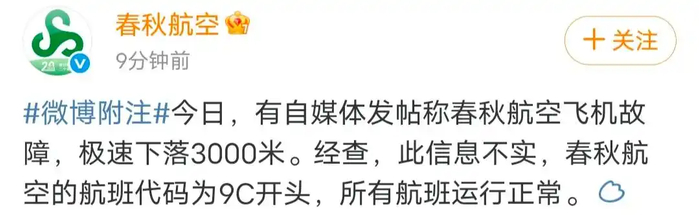 6月30日晚,春秋航空官方发布消息:今日,有自媒体发帖称春秋航空飞机故障,急速下落3000米。经查,此信息不实,春秋航空的航班代码为9C开头,所有航班运行正常。