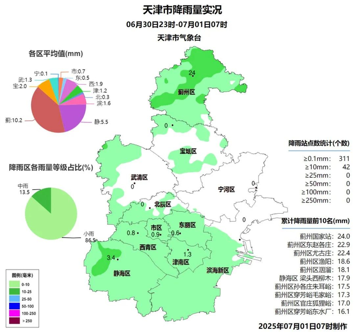 天津市气象台于2025年07月01日06时13分发布暴雨蓝色预警信号:预计今天上午,我市中心城区及环城四区、滨海新区、静海区将有中到大雨,局地暴雨,最大小时降雨量将达到30毫米,同时伴有局地6-7级短时大风。请广大市民密切关注天气变化,合理调整出行,尽量减少室外活动。外出请避开灯杆、广告牌、围挡,适时停止户外作业,加强设施除险加固。远离河道、水库、山洪地质灾害易发区等危险地区。行车避绕下沉地道、隧道等低洼易积水危险区域。发现险情或受困时,立即撤离避险并向当地政府、公安、消防及防汛部门反映和寻求救援。