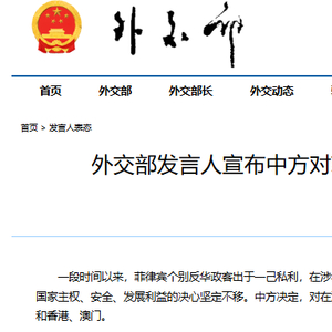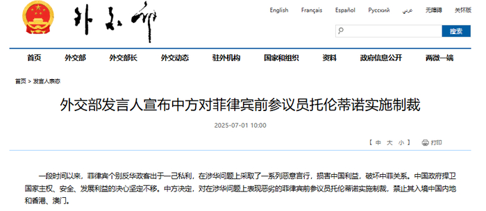 据外交部网站1日消息, 一段时间以来,菲律宾个别反华政客出于一己私利,在涉华问题上采取了一系列恶意言行,损害中国利益,破坏中菲关系。中国政府捍卫国家主权、安全、发展利益的决心坚定不移。中方决定,对在涉华问题上表现恶劣的菲律宾前参议员托伦蒂诺实施制裁,禁止其入境中国内地和香港、澳门。