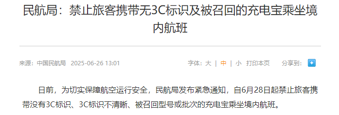 这一严格检查措施源于民航局的一纸紧急通知:自6月28日起,所有无3C认证标识、标识不清晰或属于被召回型号的充电宝,均被禁止携带乘坐国内航班。新规的出台,是为了吸取2025年多起充电宝在飞机上起火冒烟事件的教训,最终调查结果发现均与劣质电芯的安全隐患有关。