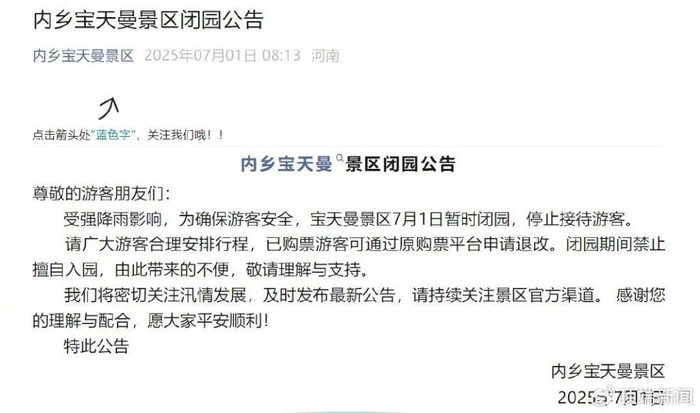 受强降雨影响,为确保游客安全,宝天曼景区7月1日暂时闭园,停止接待游客。请广大游客合理安排行程,已购票游客可通过原购票平台申请退改。