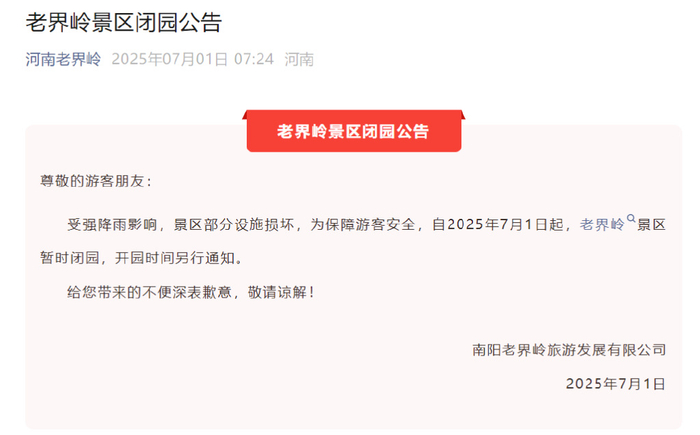 受强降雨影响,景区部分设施损坏,为保障游客安全,自2025年7月1日起,老界岭景区暂时闭园,开园时间另行通知。