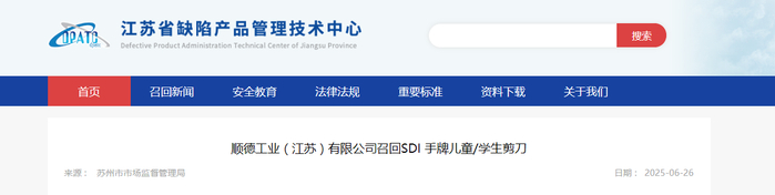 中国质量新闻网讯 据江苏省缺陷产品管理技术中心网站消息,日前,顺德工业(江苏)有限公司按照《消费品召回管理暂行规定》《江苏省缺陷消费品召回管理办法》的要求,主动向苏州市市场监督管理局报告了召回计划,将自2025年6月30日起,召回2020年01月01日至2024年12月30日期间制造的SDI手牌0839C儿童剪刀、0841C学生剪刀、0868C儿童剪刀、0924C儿童剪刀,涉及数量为117972支。