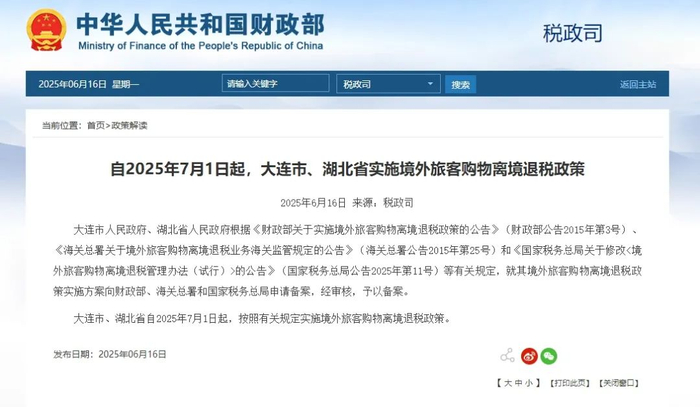 大连市、湖北省自2025年7月1日起,按照有关规定实施境外旅客购物离境退税政策。离境退税,是指境外旅客离境时,对其在退税商店购买的商品退还增值税的政策。全国符合条件的地区,经财政部、海关总署、国家税务总局备案后,均可实施离境退税政策。财政部表示,大连市、湖北省根据有关规定,就其境外旅客购物离境退税政策实施方案向财政部、海关总署和国家税务总局申请备案,经审核,予以备案。
