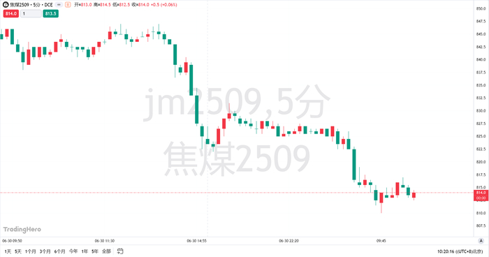 早盘焦煤主力合约延续昨夜跌势,日内增仓下跌,跌幅超3%,报814元/吨,焦炭主力合约跟随跌势,现跌近2%,于1400关口附近波动。
