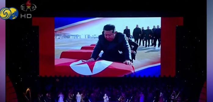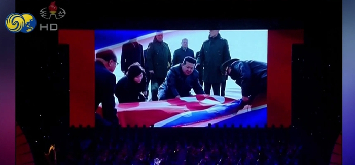 朝中社报道,金正恩6月29日在东平壤大剧院,同到访的俄罗斯文化部长柳比莫娃一起观看了俄罗斯和朝鲜文艺工作者的演出。期间,台上大屏幕播出他为一副棺木盖上朝鲜国旗的画面,神情哀伤,柳比莫娃也轻擦眼泪。