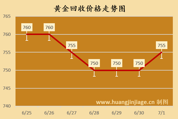 今日黄金回收价格每克755元,铂金回收价格每克284元,钯金回收价格每克226元,18K金回收价格每克543元,白银回收价格每克6.2元。(黄金行情是波动的,以结算价格为准。)