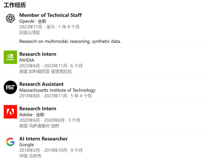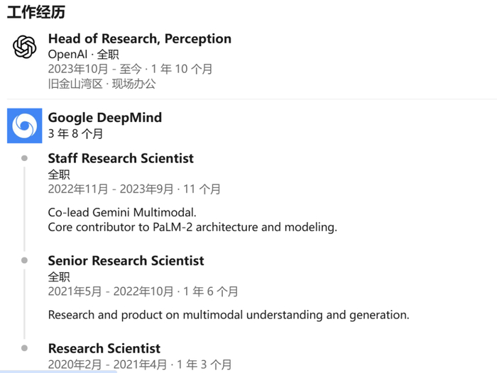 在 OpenAI 期间,他是 o3/o4-mini/GPT-4.1/GPT-4o 共同创建者,曾任 OpenAI 感知团队负责人,Gemini 多模态系统联合主管。