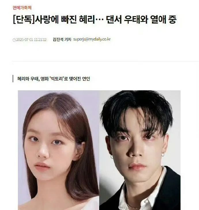 演艺界相关人士1日透露,惠利与宇泰已交往超过一年。两人的缘分始于去年上映的电影《Victory》。惠利在片中饰演充满激情的啦啦队新人队长,展现了包括DIVA《Why You Calling》、DEUX《Look Back At Me》等经典曲目的编舞,而担任这些舞蹈指导的正是宇泰。