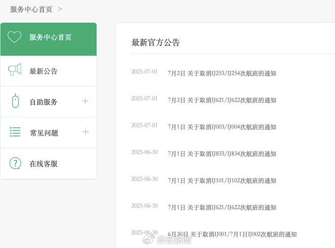7月1日上午,津云记者查询春秋航空官网发现,官网发布的多条最新公告中,日本春秋航空的多批次航班被取消,其中包括6月30日至7月2日的,东京往返上海、天津、宁波、日本札幌、日本广岛等地的航班,取消原因均是“受运力调配影响”。