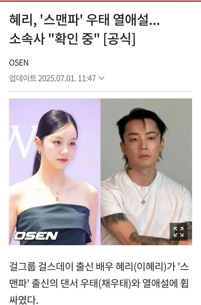 近日,据一家韩媒曝光女团Girl's Day出身的演员李惠利与《街头男战士》出身的舞者车禹泰恋爱,相关人士还透露他们会在首尔约会。