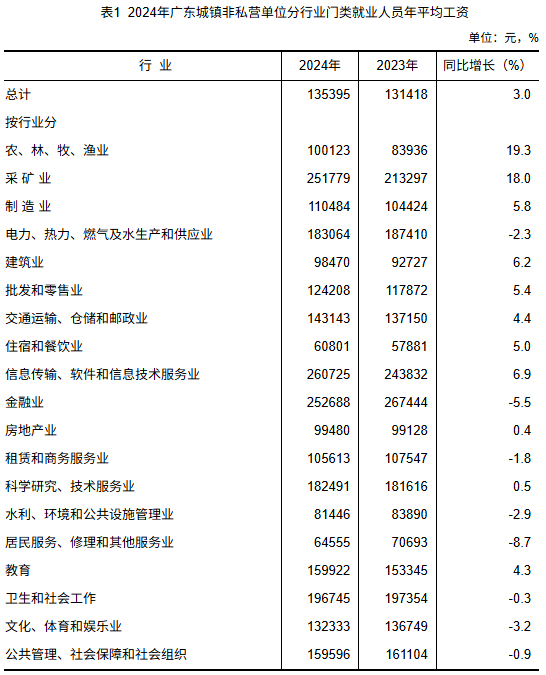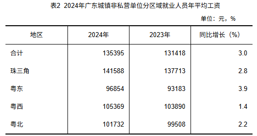 2024年,河源市城镇非私营单位就业人员年平均工资为94952元,同比增长2.4%;其中,在岗职工年平均工资为97095元,同比增长3.7%。城镇私营单位就业人员年平均工资为63051元,同比增长0.8%。